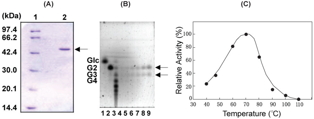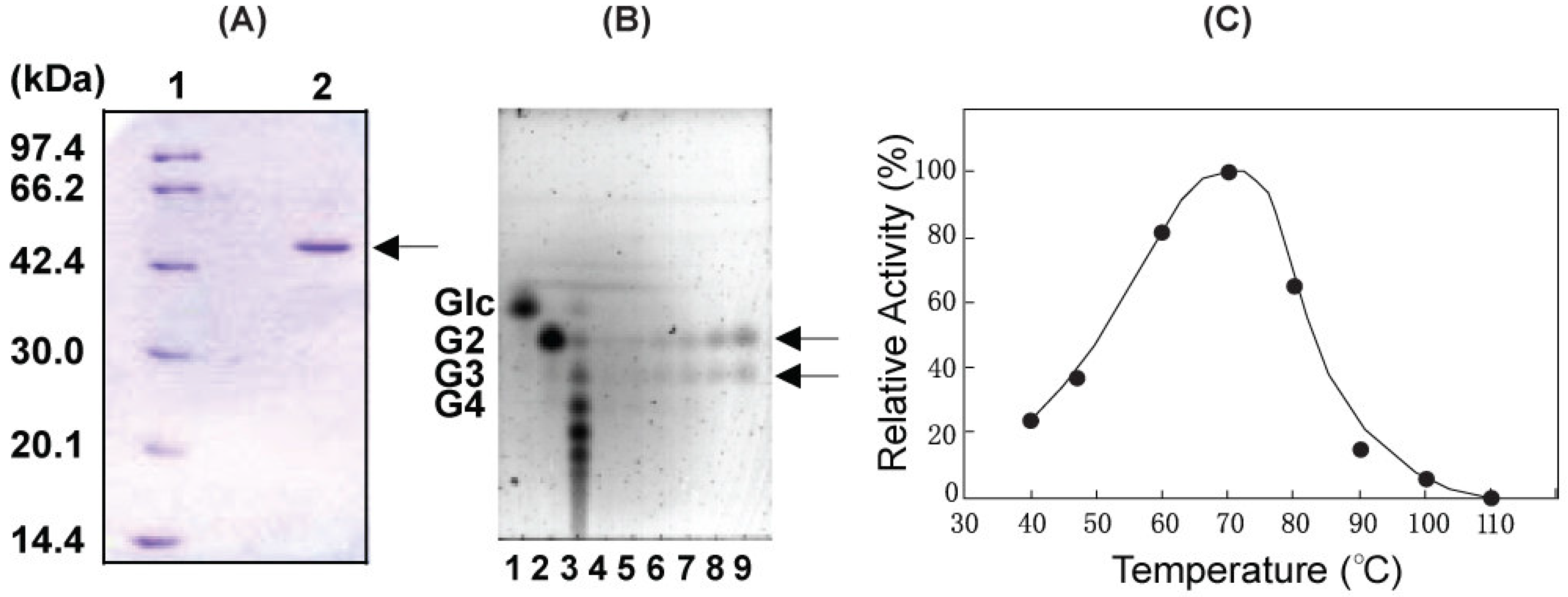 (A) SDS-PAGE analysis of purified TcCel5A. Purified enzymes were electrophoresed on a 12.5% SDS-PAGE. Lane 1, standard marker proteins; lane 2, purified enzymes. (B) Analysis of degradation of ASC by TcCel5A. The reaction mixture consisting of 0.1 ml of 0.5% ASC in 100 mM acetate buffer (pH 7.0) and 0.1 ml of enzyme was incubated at 70ºC. After incubation for 10 min, 30 min and 18 hours, the reaction mixture was analyzed by thin-layer chromatography. Lane 1: Glucose (standard), lane 2: Cellobiose (standard), lane 3: Cellooligosaccharide (standard), lane 4 and 5: 10 min reaction mixture, lane 6 and 7: 30 min reaction mixture, lane 8 and 9: 18 hours reaction mixture. (C) Effect of temperature on the enzyme activity of TcCel5A.