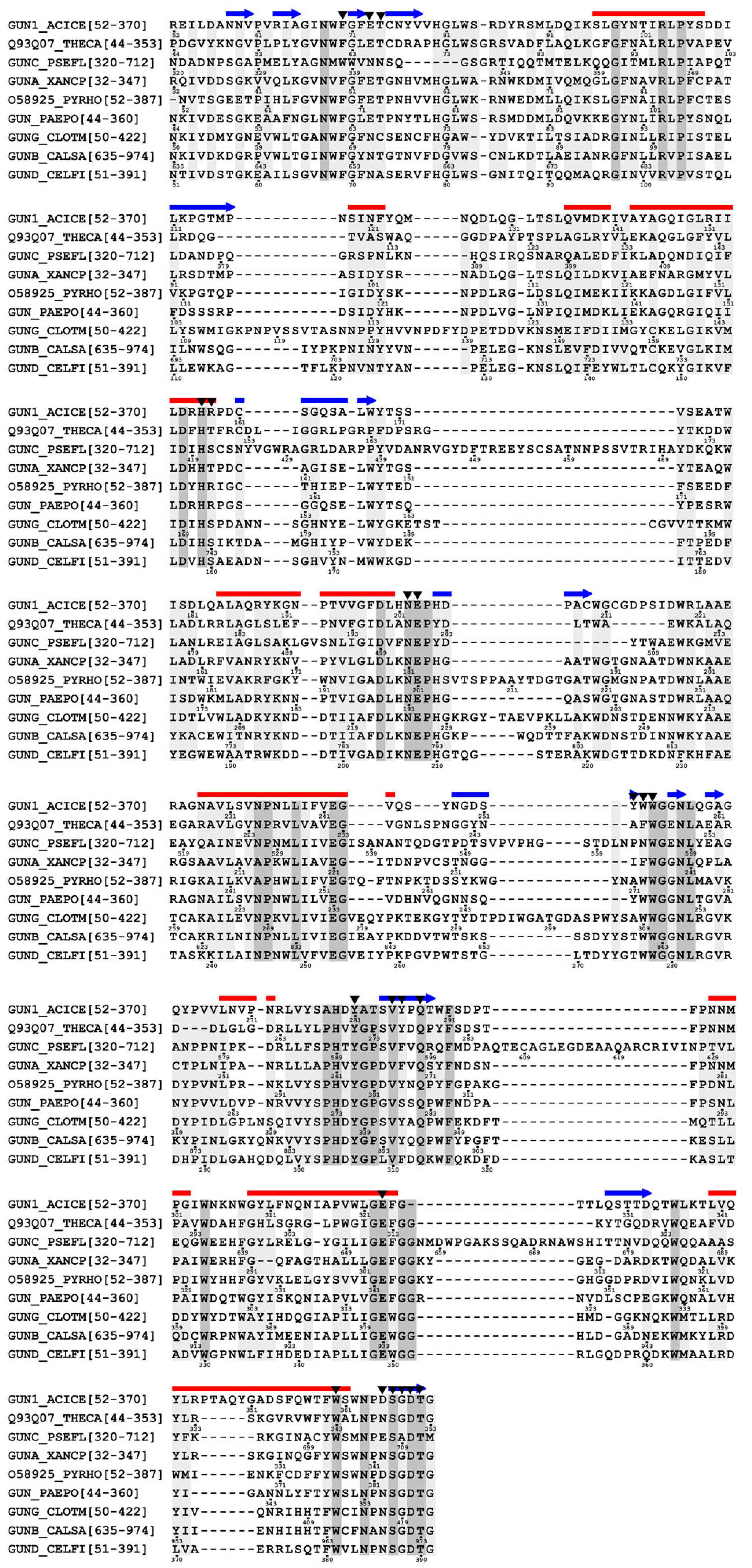 Structure-based sequence alignment of nine family 5 glycosyl hydrolases, two of which have known structures. The secondary structural elements (β-strand, blue; α-helix, red) are indicated above the sequences. The 21 active site residues are indicated by inverted triangles. The protein sequences, with their SwissProt or PDB access codes and selected sequence numbers indicated in parentheses, are: Adicothermus cellulolyticus (Entry name:GUN1_ACICE, PDB:1ECE, Sequence No:52-370); T. caldophilus GK24 (Q93Q07_THECA, 44-353); Pseudomonas fluorescens (GUNC_PSEFL, 320-712); Xanthomonas camprestrs pv. campestris (GUNA_XANCP, 32-347); Pyrococcus horikoshii (O58925_PYRHO, 52-387); Paenibacillus polymyxa (GUN_PAEPO, 44-360); Clostrdium thermocellum (GUNG_GLOTM, 1CEM, 50-422); Caldicellulosiruptor saccharolyticus (GUNB_CALSA, 635-975); Celllomonas fimi (GUND_CELFI, 51-391).