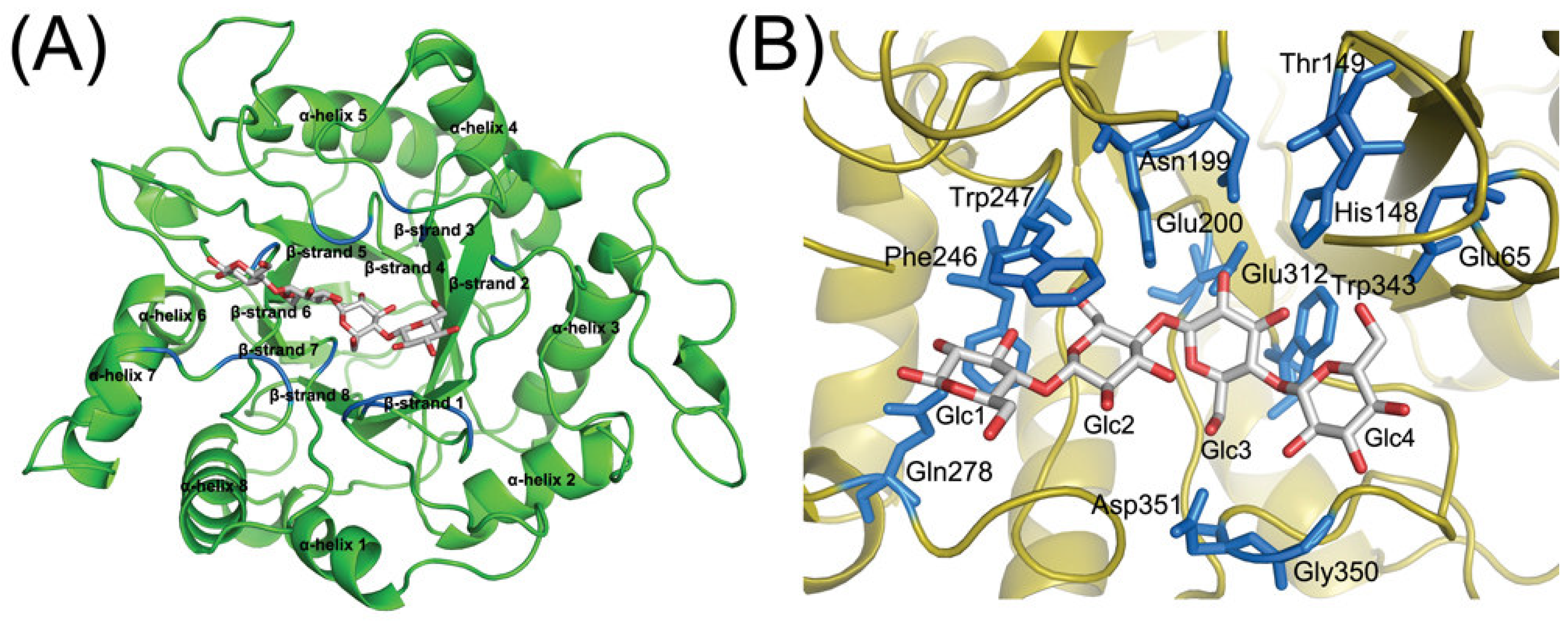 (A) The final structure of the TcCel5A-G4 complex. (B) Active site residues of TcCel5A that bind G4.