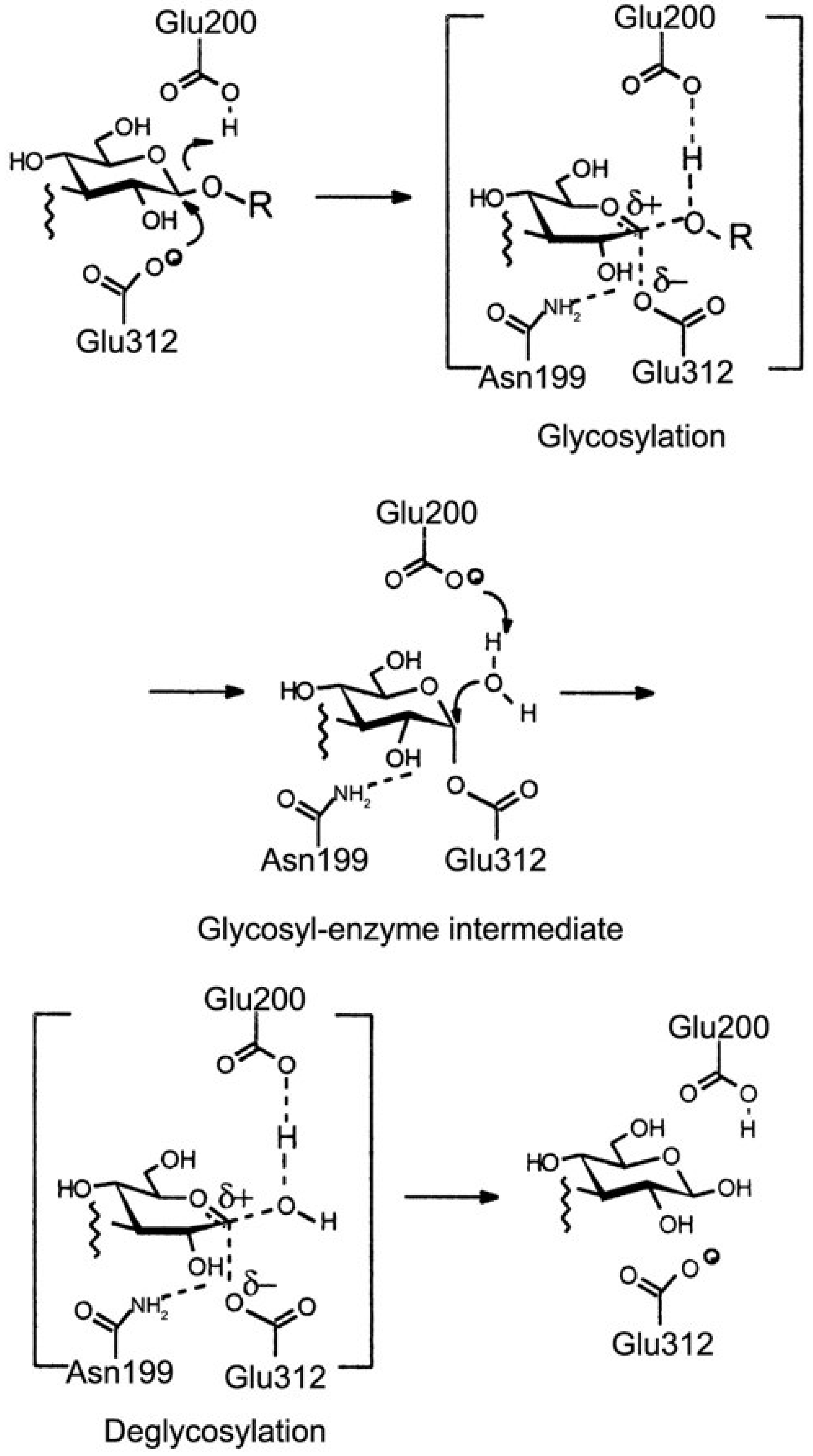 Proposed mechanism of hydrolysis by Thermus caldophilus GK24 endocellulase, a retaining glycosidase, involving a double-displacement reaction.