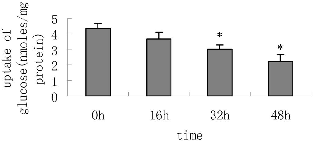 1×106 cells were seeded in 12 wells multiplates, and cultured for 48 h until they reached confluence. Then the cells were treated with 5mmol/L sodium butyrate for 0 (without treating with sodium butyrate), 16, 32, 48h before glucose transport measurements. After washing, cells were incubated for 5 minutes in the present of 2-deoxy-D[3H]-glucose, the glucose transported was detected as described in the “materials and methods”. With the treatment of sodium butyrate more than 16h, the transport of glucose decreased obviously compared to that without adding sodium butyrate (p *<0.05).