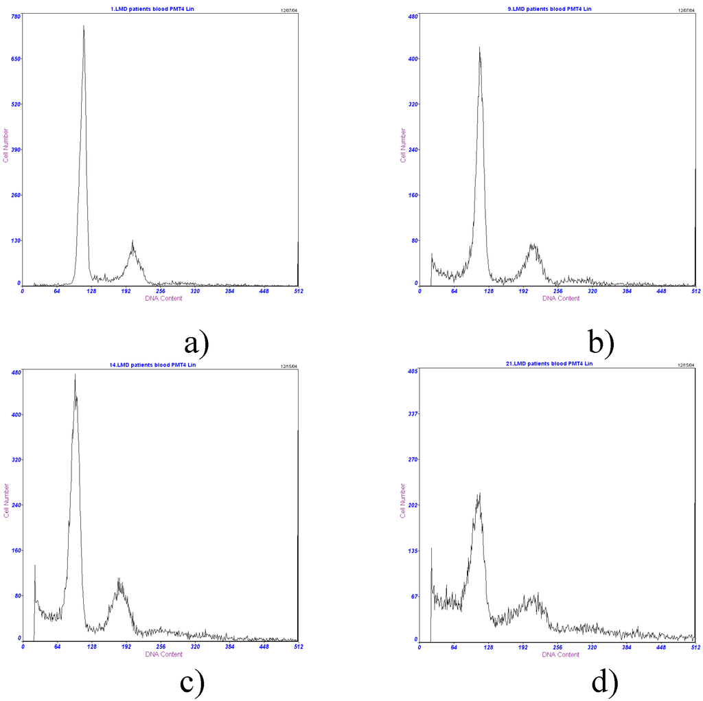 a) In the condition of 2000mg/L glucose for 48h, without sodium butyrate, the apoptosis was very low.(0.4±0.2%). b) In the condition of 0mg/L glucose for 48h, without sodium butyrate, apoptosis was observed in a few cells (4.1±1.8%). c) In the condition of 2000mg/L,treated with 5mmol/Lsodium butyrate for 48 h,apoptosis of many cancer cells was observed (11.0±3.7%). d) In the condition of 100mg/L glucose,treated with 5mmol/Lsodium butyrate for 48 h,a great deal of apoptosis in HT-29 colonic cancer cell were found (28.7±7.2%)(FCM).