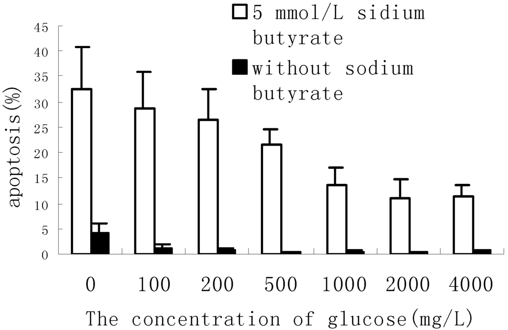 Treated with 5mmol/L sodium butyrate for 48 h,with the increase of concentration of glucose from 0mg/L to 2000mg/L, the apoptosis of HT-29 colonic cancer cell decreased obviously (p<0.05). Without sodium butyrate, when the concentration of glucose was less than 200mg/L, apoptosis in a few cells was observed, but when the concentration of glucose was more than 200mg/L, the apoptosis was very low.