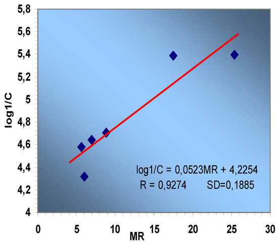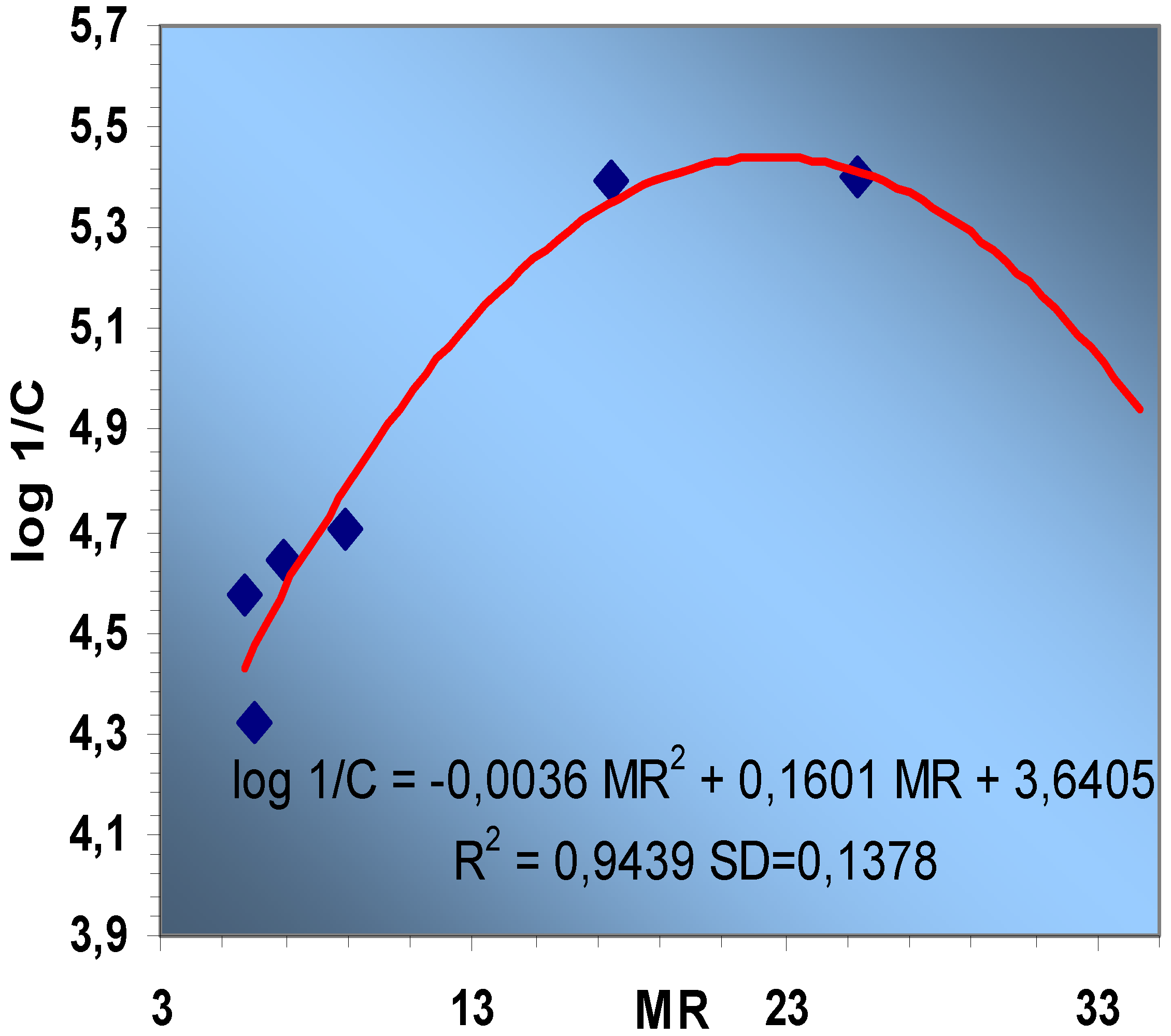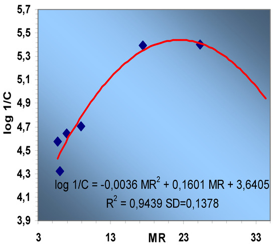 Knowing this fact, we tried to find parabolic correlations and thus an excellent correlation is obtained between log1/C and MR, (Figure 4):