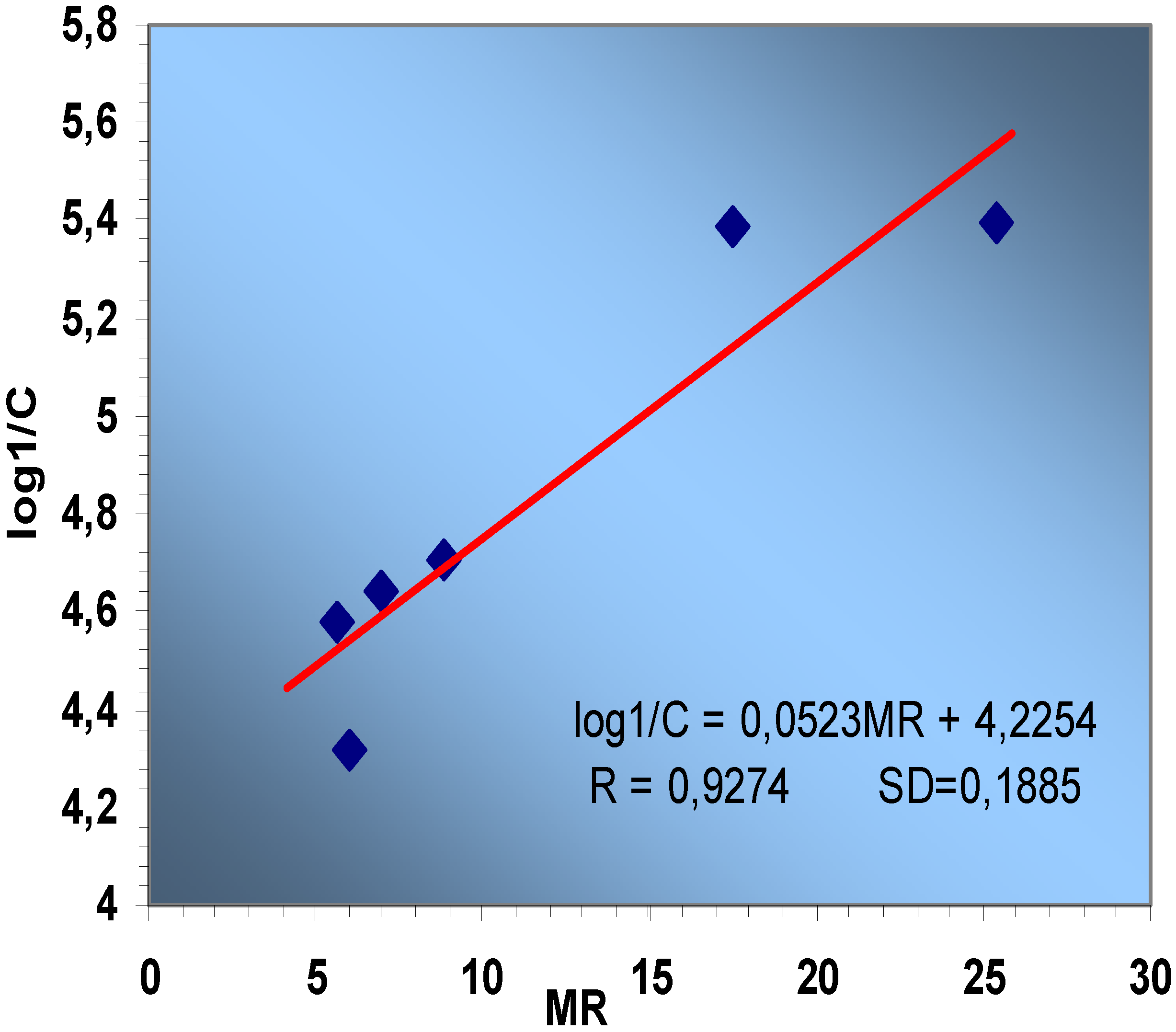 log 1/C = - 0.0036 MR2 + 0.1601 MR + 3.6405