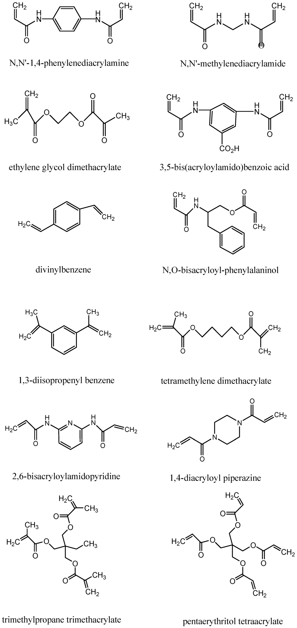 - Hosoya, K.; Yoshizako, K.; Shirasu, Y.; Kimata, K.; Araki, T.; Tanaka, N.; haginaka, J. Molecularly imprinted uniform-size polymer-based stationary phase for high-performance liquid chromatography structural contribution of cross-linked polymer network on specific molecular recognition. J. Chromatogr. A 1996, 728, 139–147. [Google Scholar]