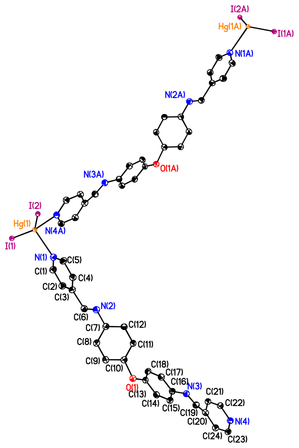 dHg–I = 2.640 Å) are virtually equivalent, as are the two Hg– N bond distances (