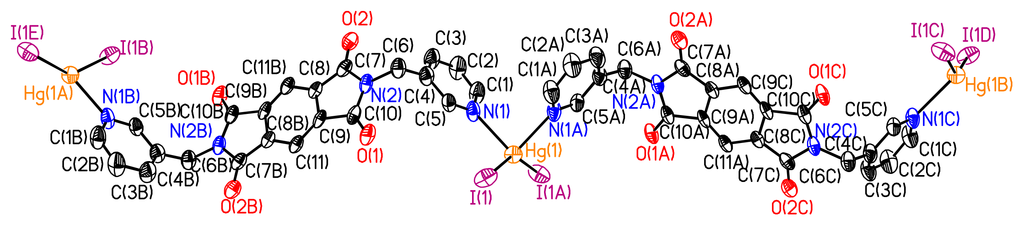 a, whereas the nearest Hg···Hg separation in each zigzag chain is 18.013 Å. The Hg(II) is in a distorted tetrahedral geometry with its coordination sphere completed by two I– anions. The two Hg–I distances (
