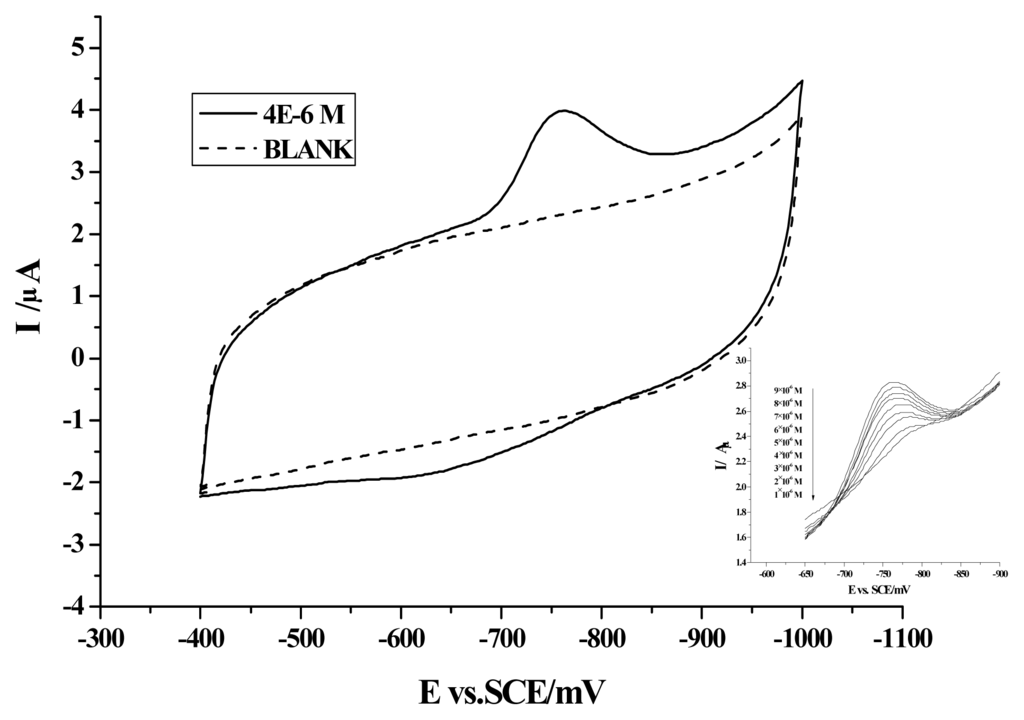 In order to use electrochemical technique to study the interaction between camptothecin and HSA, we have first studied the electrochemistry of the molecule. Up to now, no voltammetric study of this species has been reported, although the behavior of camptothecin at a hanging mercury drop electrode has been presented [13]. We have found that camptothecin is electroactive at a PG electrode in Britton- Robinson buffer, with the pH range of 2.0 to 7.0. As shown in Fig. 1, with 4.0×10−6 M camptothecin in a pH 4.0, 0.1 M Britton-Robinson buffer solution, a well-defined cathodic peak appears at −0.75 V (vs. SCE) at the PG electrode. Meanwhile, a slight anodic peak is also observed. However, compared with the cathodic peak, the anodic peak is unstable and disappears after several cycles of scanning. In contrast, no voltammetric peak can be obtained at the PG electrode in the absence of camptothecin. Furthermore, the canodic peak rises with the increasing concentration of camptothecin correspondingly. So, the cathodic peak should be attributed to the reduction of camptothecin at the PG electrode.