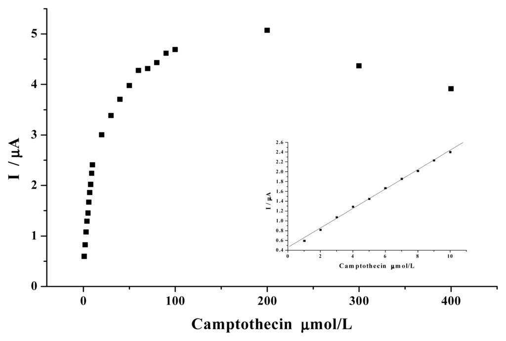 Dependence of the cathodic peak current on the camptothecin concentration. Others same as in Figure 1.