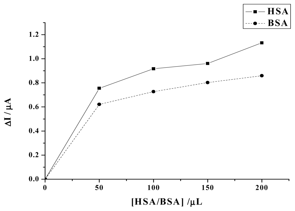 We assume that it is the interaction between HSA and camptothecin and the formation of the nonelectrochemical complex that makes the decrease of peak current of camptothecin. In order to confirm the specific interaction between HSA and camptothecin and the formation of the non-electochemical complex, we have employed BSA as a contrast. HSA and BSA are highly homologous proteins [22], but camptothecin can not bind BSA [12]. If no interaction exists and no complex forms between HSA and camptothecin, the decrease of the peak current of camptothecin caused by HSA and BSA should be almost the same. However, as is shown in Fig. 7, the decrease caused by BSA is obviously less than HSA. Therefore, the result has not only revealed the existence of the specific binding between camptothecin and HSA, but also suggested that the competitive adsorption of HSA is not the main reason of the decrease of camptothecin peak current.