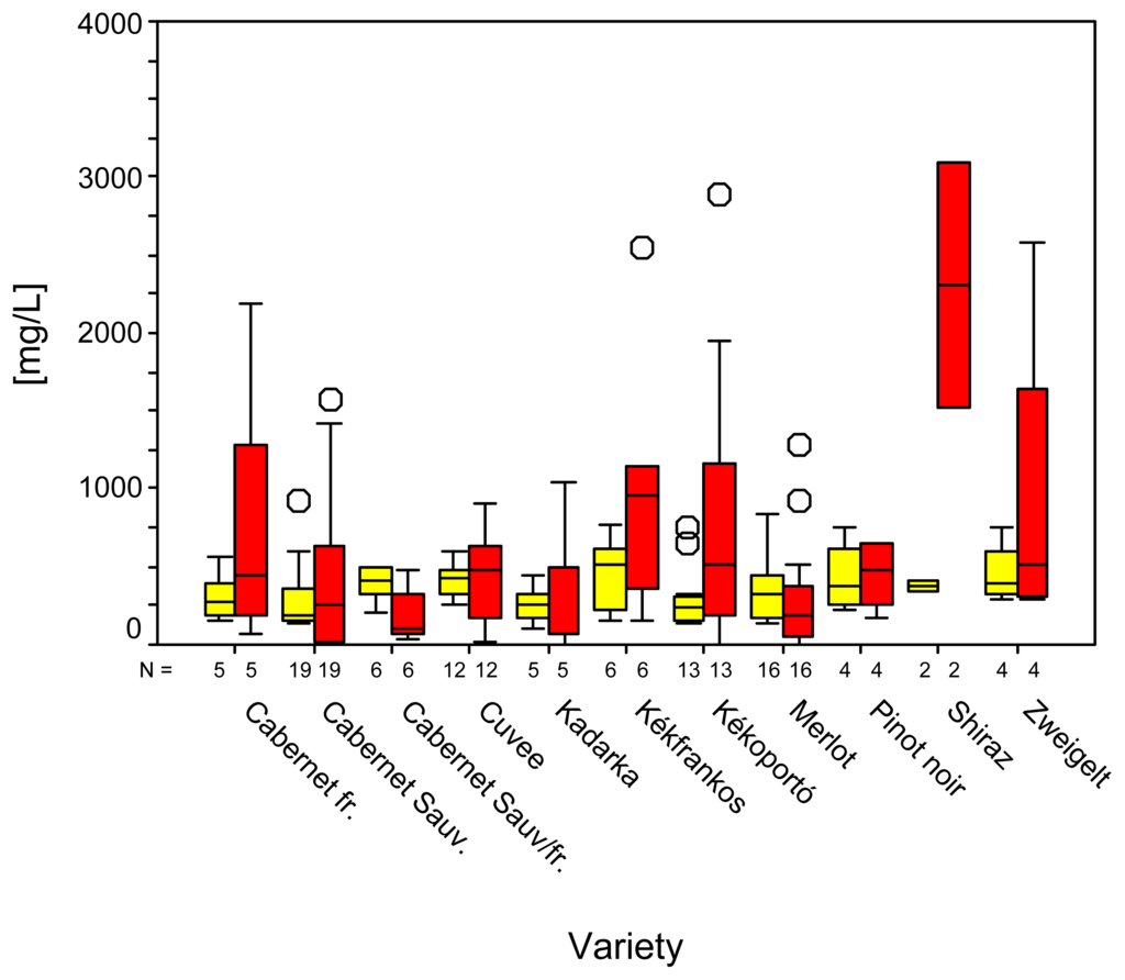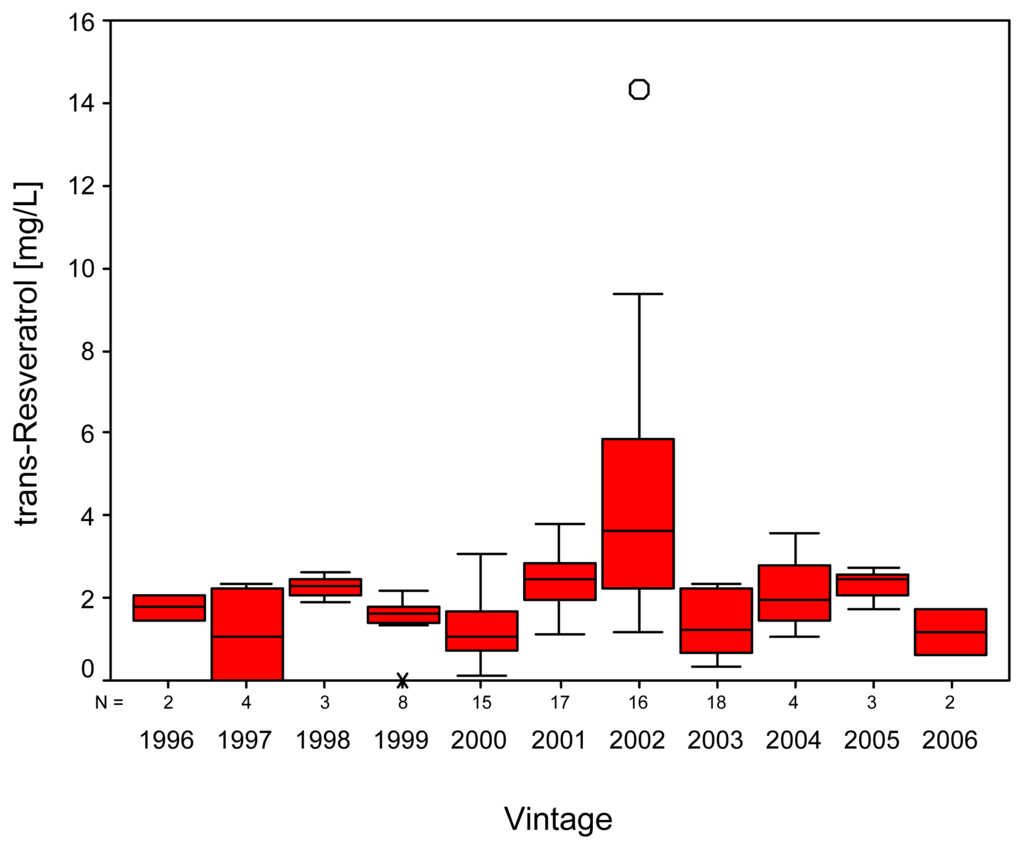 The concentration of trans-resveratrol seems also to be dependent on winery origin as already published by Bavaresco (2003). In our studies especially high concentrations were found in the wines from the Polgár winery.