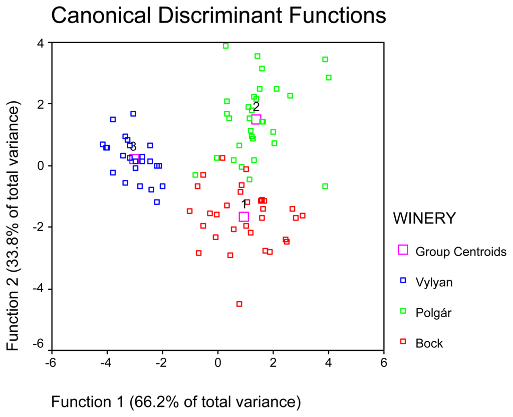 Using canonical discriminant analysis wines could be separated by origin (winery) based on their polyphenol content (Figure 2). These results show that different applied techniques during winemaking seem to have a much more decisive influence on the final polyphenolic composition of red wines than such things as variety and micro-climate, often also referred to as “terroir” [–].
