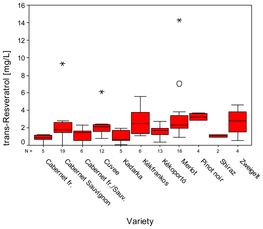The highest concentrations on resveratrol were found in Merlot, Pinot noir, Kékfrankos, and Cabernet Sauvignon (ref. figure 4). Other studies have already shown that especially wines made from grapes of the Pinot family show especially high contents on resveratrol [,]. Our results are, thus, in accordance with earlier published data.