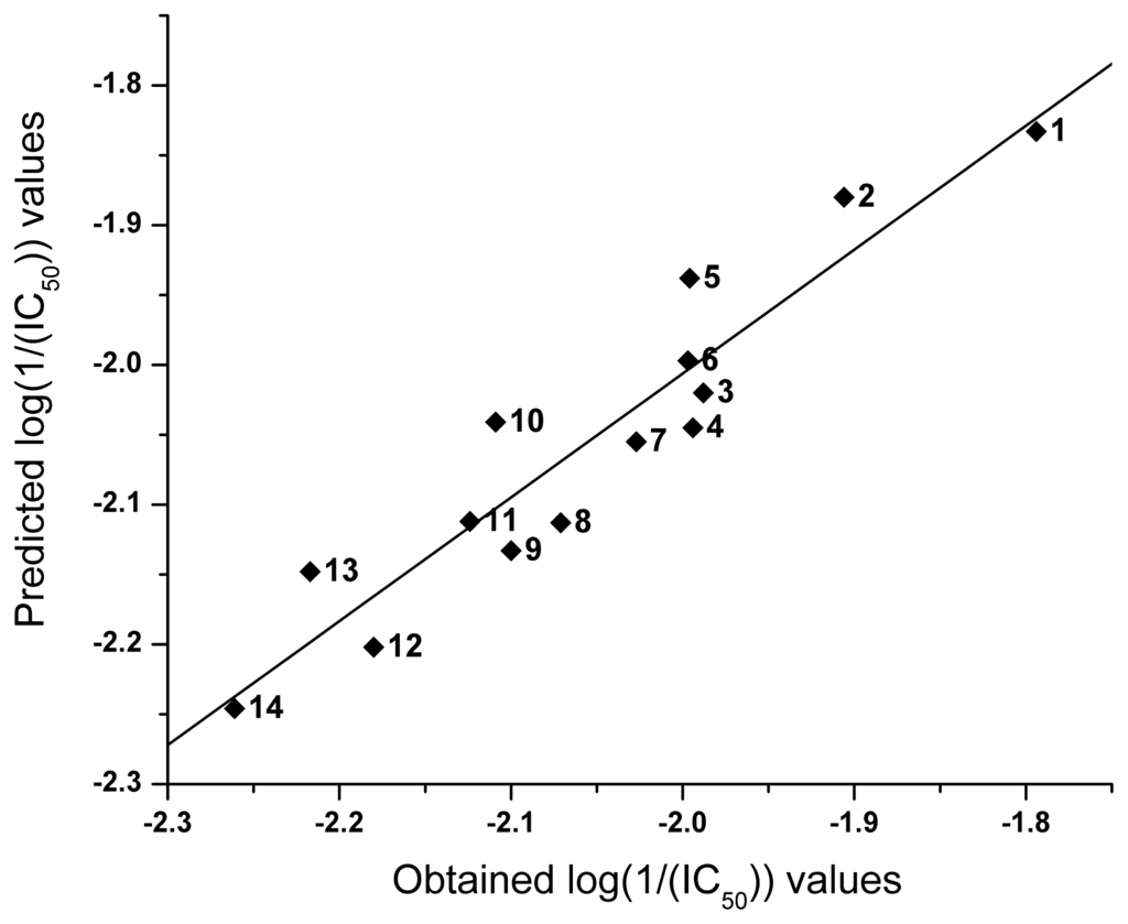 Values of used descriptors, obtained, and from the Equation 1 predicted log(1/(IC50)), are given in Table 2. The relationship between obtained vs. predicted log(1/(IC50)) in graphical form are given in the Figure 2. The higher weight descriptor in correlation is the estimated logP, while indicator variable that describes the stereoelectronic demands for the activity has a comparable weight.
