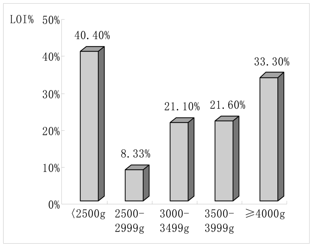 We also compared the physical constitution of the infants. The mean BW was 3462.7 ± 460.2 g vs. 3363.7 ± 427.7 g in the LOI and the normal imprinting group, respectively (p = 0.127). Other body indexes did not show any significant differences as well, including BMI, sitting height, head circumference, chest circumference and shoulders radical lines. However, abdominal circumference in the LOI group tended to be larger than that of the normal imprinting group (p = 0.053), although the difference is not significant. In addition, in comparison to the 15.3% (33/216) in the normal imprinting group, the frequency of 2500 – 2999 g BW in LOI group is only 5.3% (3/57) (p < 0.05). The occurrence of BW over 4000 g in the LOI group, on the other hand, was 12.3% (7/57), which is not significantly higher than the 6.5% (14/216) in the normal imprinting group (p = 0.144), while the incidence of low BW under 2500 g was 3.5% (2/57) in LOI group, in comparison to the 1.5% (3/216) in the normal imprinting group (p = 0.288) (see Table 3). In comparing the rate of LOI of IGF2 among the different BW groups, the graph revealed a U shaped distribution (see Figure 1), with the LOI rate of BW under 2500 g to be surprisingly as high as 40% (2/5), which is the highest rate among the BW groups compared. Due to the limited number of cases, we were unable to note any statistical differences among the other groups. We also evaluated and compared the relationship between BW and the decrease in the level of plasma glucose 2 hours after birth and found that the plasma glucose values for infants with BW under 2500 g and over 4000 g with LOI were all 2.8 mmol/L, which is larger than the 1.5 mmol/L and 1.2 mmol/L found in normal imprinting infants (p < 0.01). We followed up the newborns with LOI for 30 days and, after the 30-day period, scanned the infants’ livers and kidneys using ultrasound but failed to find any neoplasm among them. We also measured the weight gain of all of the LOI infants as well as 60 of the 216 normal imprinting infants during the 30-day period. The mean weight gains in the LOI and normal imprinting groups were 1173 ± 258.6 g and 1246.0 ± 243.3 g, respectively (p = 0.118).