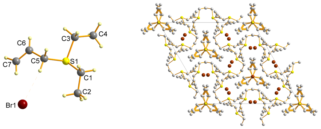 [C7H15S]Br, Mw = 211.16, crystal system = trigonal, a = 17.8173(8) Å, b = 17.8173(8) Å, c = 21.4885(14) Å, α = 90°, β = 90°, γ = 120°, V = 5907.7(5) Å3, T = 140(2) K, space group = R3c, Z = 24, (Mo-K) = 0.71073 Å, 11152 reflections collected, 2305 independent reflections, Rint = 0.0466, R1 [I > 2(I)] = 0.0311, wR2 (all data) = 0.0734.