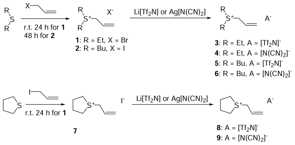 The synthetic route used to prepare the allyl-functionalized sulfonium salts described herein is illustrated in Scheme 1. In the first step the appropriate allyl halide and disulphide are reacted in acetone and stirred at room temperature to afford dialkyl-allyl-sulfonium halides, [C2allylsul]Br 1 and [C4allylsul]I 2. Diethyl sulphide reacts rapidly with allyl bromide to afford product 1 as a colourless powder directly from the reaction mixture. In contrast, the synthesis of 2 required the more active alkylation agent, allyl iodide, in order to proceed under mild conditions and in high yield.