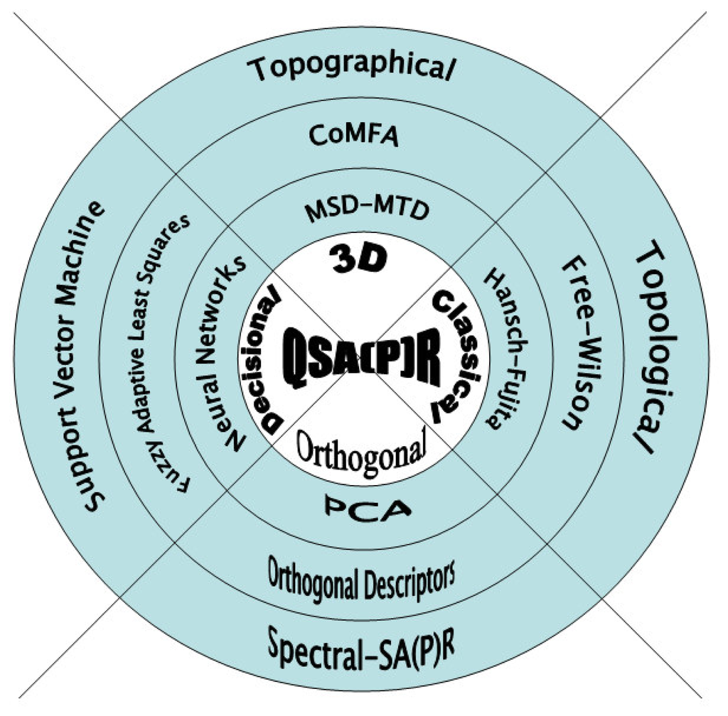 However, although the main purpose of QSARs studies is all about finding structural parameters that best correlate with the activity/property of the interactions observed, a multitude of methods of attaining this goal have appeared. They struggle to identify the most appropriate manner of quantifying the causes in such a way that they may be reflected in the measurement with maximal accuracy or minimal error. Phenomenologically, these methods can be conceptually grouped into “classical” [11–19], “3-dimensional” [20–30], “decisional” [31–42], and “orthogonal” ones [43–57], together represented as in Figure 1.