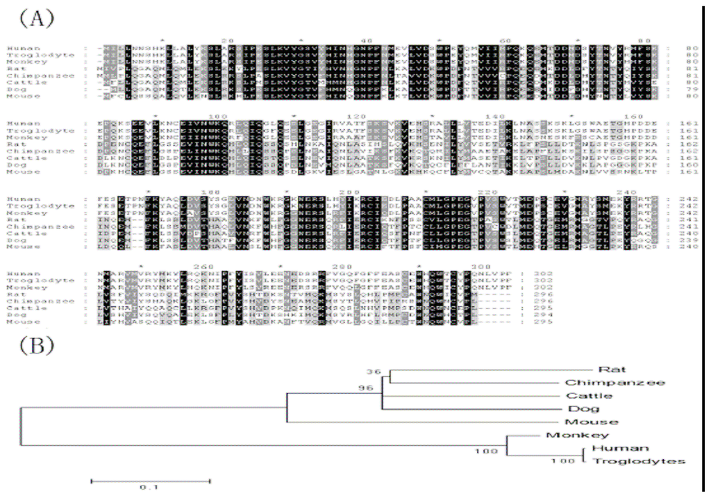 Bioinformatic analysis of human GLYATL1 Protein. (A) The sequence alignment of deduced amino acid sequences of human GLYATL1 protein and its orthologs. Identical amino acids are shaded in black, similar amino acids are shaded in gray. The sequences used for alignment include: human (AAZ31239), troglodytes (XP_508446) monkey (XP_001092316), rat (NP_001009648), cattle (NP_803479), mouse (BAE38231), dog (XP_540581), chimpanzee (CAH93052); (B) Phylogenetic tree of GLYATL1 and its orthologs. A phylogenetic tree was constructed with the bootstrap N-J method using program Mega with 1000 bootstrap trials.
