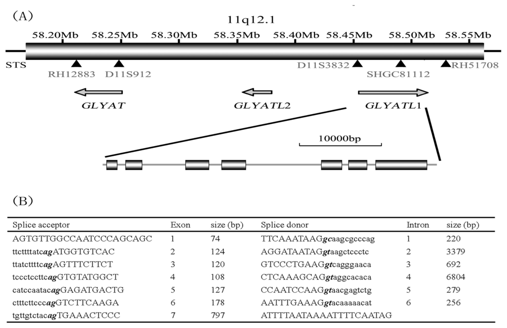 After searching the UCSC genomic database ( http://genome.ucsc.edu), the GLYATL1 gene was mapped to chromasome11q12.1. The STS markers (D11S3832, SHGC81112, RH51708) and the putative gene GLYAT and GLYATL2 situated adjacent to the location (Figure 3A). Our search also showed that the GLYATL1 gene has seven exons and six introns and all sequences at the exon-intron junctions comply with the AG-GT consensus sequence (Figure 3B).