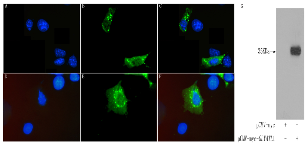 Subcelluar localization and expression of GLYATL1 protein in COS-7 cells. Immunofluorescence localization of GLYATL1 in COS-7 cells. Cells expressing Myc-tagged GLYATL1 were stained with monoclonal antibody against Myc epitope. (A, D) The nucleus of cells transfected with pCMV–Myc–GLYATL1 was stained with DAPI. The nucleus was shown by the blue fluorescence; (B, E) The localization of GLYATL1 was shown by the green fluorescenc; (C, F) The merged image of panels (A, B) and (C, D) respectively; (G) Western blot analysis of pCMV–Myc– GLYATL1 expressed in COS-7 cells. The band was approximately 35 kDa, which corresponding to the predicted molecular weight of GLYATL1. Mock pCMV–Myc was used as a control.