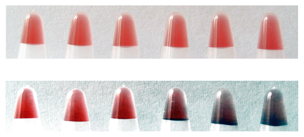 Salt-resistance for AuNPs from method II (top) and method I (bottom).(From left to right: addition of 0, 5, 10, 15, 20, 25 μl of 0.1 M PBS)