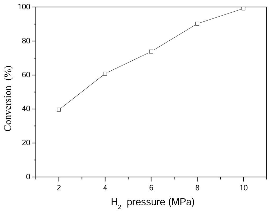 The influence of hydrogen pressure has been studied for benzoic acid hydrogenation in the presence of 10 MPa CO2 as shown in Figure 1. The conversion increased linearly with increasing H2 pressure from 2 to 10 MPa and a high conversion of 99.1 % was achieved at H2 pressure of 10 MPa, while it is about 39.6 % at 2 MPa, suggesting the reaction rate depends on the concentration of hydrogen largely in scCO2.