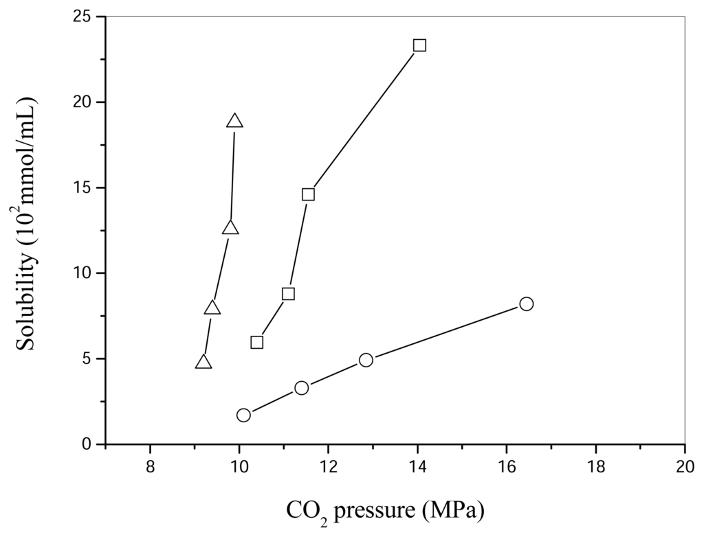 Solubility estimation of benzoic acid, cyclohexanecarboxylic acid and mixture of them in CO2 at 323 K. △ cyclohexanecarboxylic acid; □ the mixture of benzoic acid and cyclohexanecarboxylic acid; ○ benzoic acid.