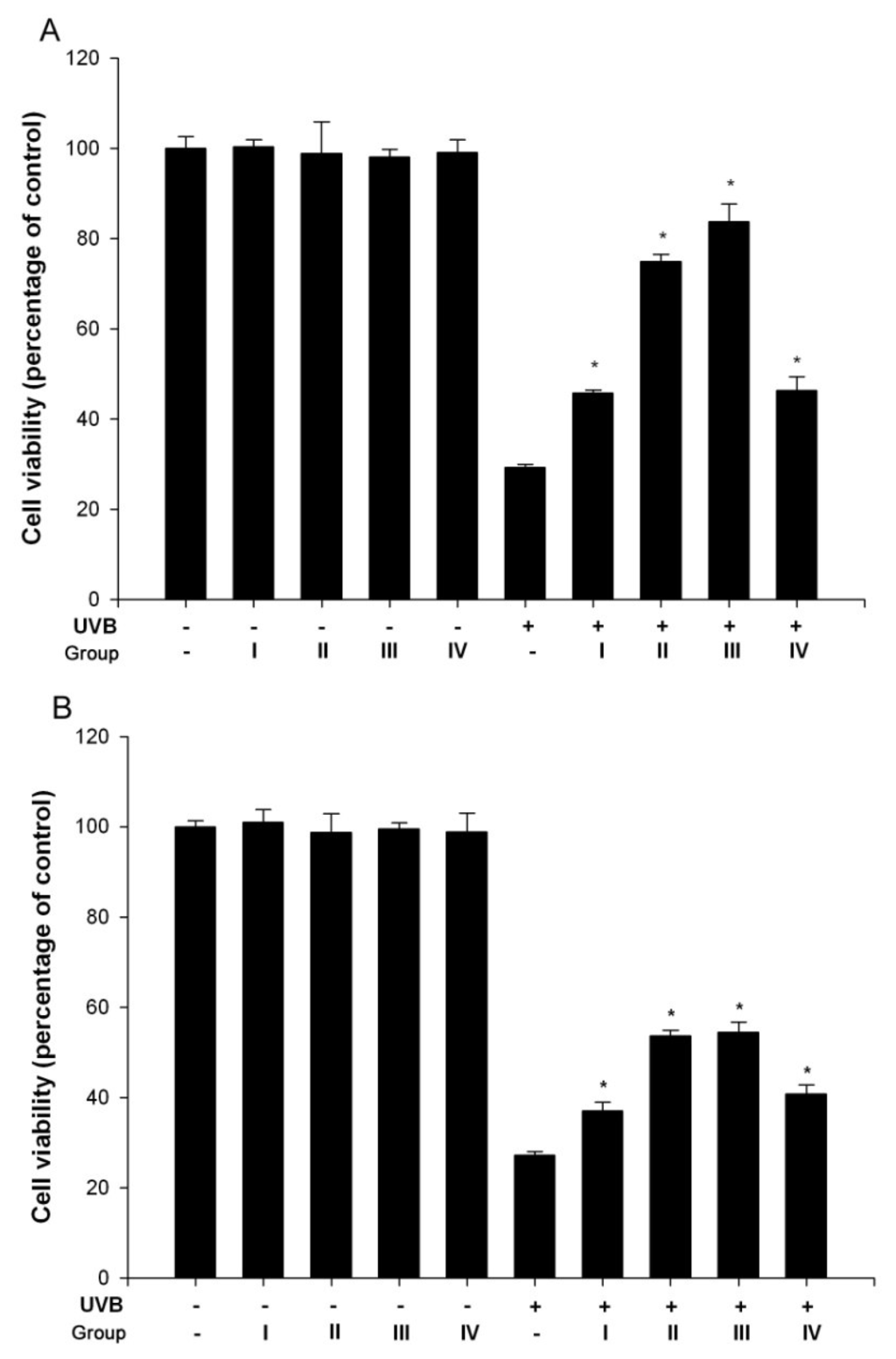 To determine protective effects of isoflavone extracts obtained from soybeans (group I~IV, Table 1) on UVB-irradiated keratinocytes, cell viability was determined by the MTT assay. Figure 1 shows that isoflavone extracts alone didn’t affect keratinocyte viability but keratinocytes viability was decreased after UVB exposure.