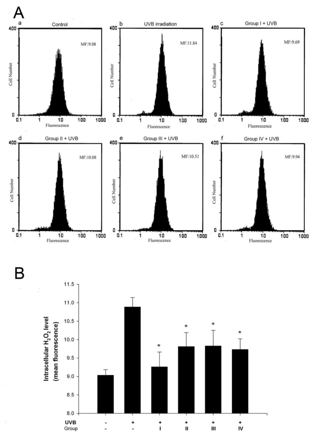 As shown in Figure 2, flowcytometric analysis showed that mean fluorescence, i.e. H2O2 production, was increased in UVB-treated cells (Figure 2A, panels a and b). The increase of intracellular H2O2 by UVB irradiation was decreased by the treatment of these isoflavone extracts (Figure 2), while the basal level of intracellular H2O2 was not affected (data not shown). The result directly demonstrated that all isoflavone extracts have potent scavenging activity which can prevent UV induced intracellular H2O2 production.