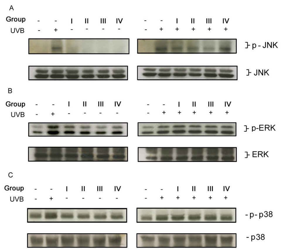Ultraviolet B irradiation has been shown to activate ERK1/2, JNK, and p38 kinase [;;], which may lead to skin cell damage. Thus, we examined if these isoflavone extracts could affect UVB-induced MAPK activation. We observed that ERK1/2, JNK, and p38 phosphorylation were apparently increased in UVB-irradiated keratinocytes.