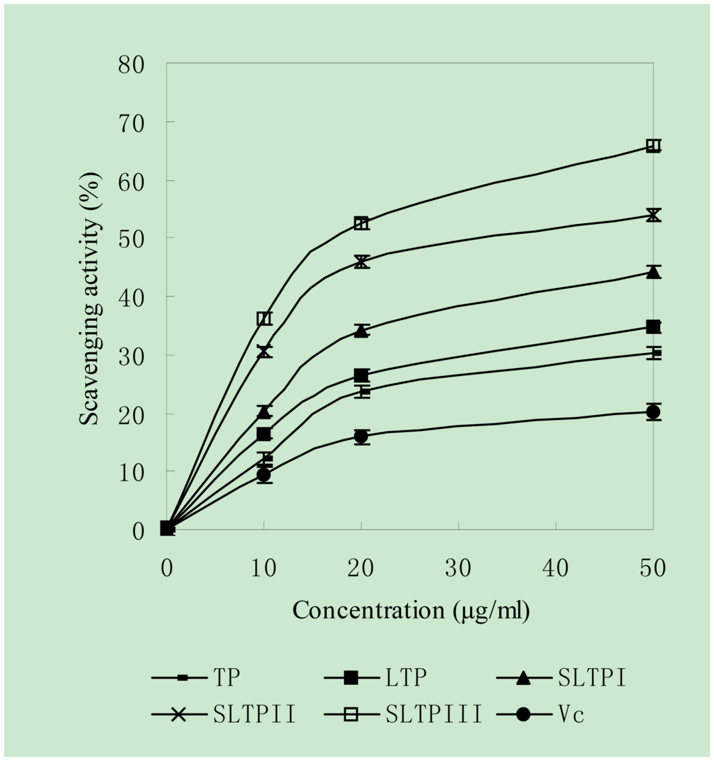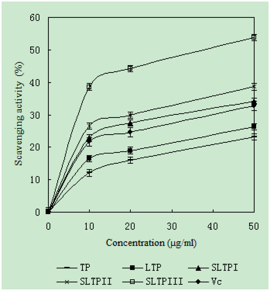 Hydroxyl radical and its subsequent radicals are the most harmful ROS and they are responsible for the oxidative injury of biomolecules []. The scavenging activity of all samples and Vc are shown in Figure 3. The results suggested that SLTP, possessed more pronounced hydroxyl radical scavenging activity than LTP, TP and Vc (P < 0.05), and the scavenging activity increased with increasing the concentration. The scavenging activity of SLTPIII was obviously higher than other polysaccharides, and the highest scavenging activity was 65.9 %. The scavenging activity of SLTPIII at 10 μg/ml was found to be 36.1 %. The same scavenging activity could be obtained for LTP at 50 μg/ml. Vc showed the lowest scavenging activity against hydroxyl radical among all samples tested.