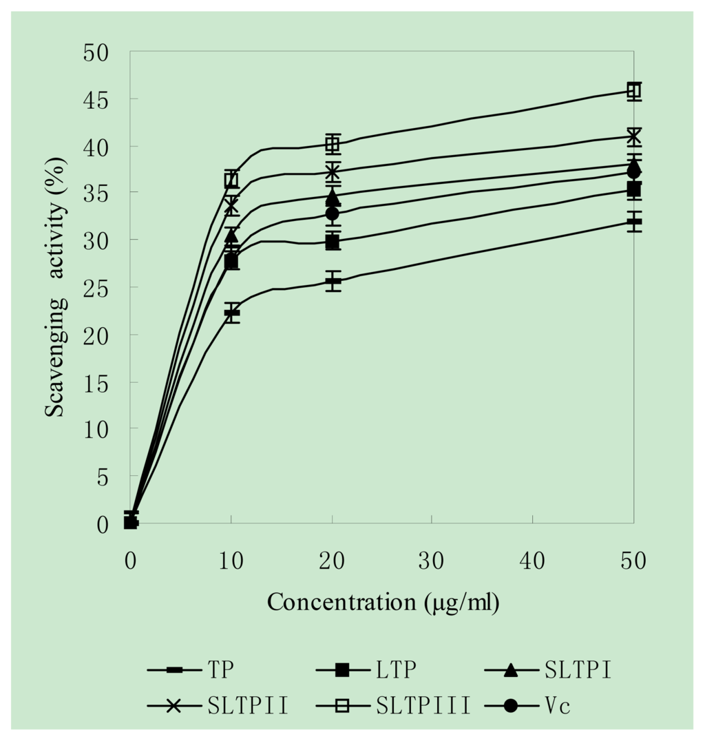 One of the mechanisms involving in antioxidant activity is the ability of a molecule to donate hydrogen atom to radical and the propensity of hydrogen donation is the critical factor affecting free radical scavenging activity []. The SLTP appeared to function as good hydrogen atom donors and was able to terminate radical chain reactions by converting free radicals to more stale products. Hence, SLTP showed more pronounced antioxidant activity than LTP. Degradation of TP into LTP could also improve the hydrogen atom donation effect. This might be the reason that LTP showed better antioxidant activity than TP.