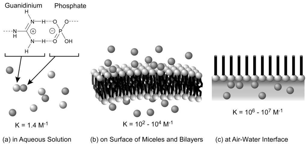 Typical binding constants between phosphate and guanidinium for various aqueous media interfaces: (a) in aqueous solution; (b) on the surface of micelles and bilayers; (c) at the air-water interface. Reprinted with permission from [] ©1996, American Chemical Society.