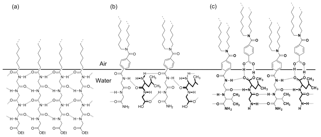 - Cha, X.; Ariga, K.; Onda, M.; Kunitake, T. Molecular recognition of aqueous dipeptides by noncovalently aligned oligoglycine units at the air/water interface. J. Am. Chem. Soc 1995, 117, 11833–11838. [Google Scholar]