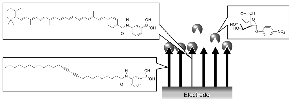 Saccharide species are also important bioactive components. For example, recognition of saccharide is crucial in processes such as virus infection, and research on recognition of saccharide species has been recently investigated at the air-water interface []. Recognition of saccharides at the air-water interface was initiated in the late 1980s and 1990s and is exemplified in the cyclic resorcinol tetramer host reported by Kurihara et al. []. This was followed by several examples with synthetic hosts such as phenylboronic acid [] or a macrocyclic sugar cluster. []. Recently, Miyahara and Kurihara reported rational design of LB films that are capable of electrochemical detection of redox-active saccharides (Figure 3) []. The boronic acid-functionalized, electroconductive LB film was fabricated by polymerization of a 1:10 mixture of a carotenoid type amphiphile and a polymerizable amphiphile. The selectivity of the electrode for sugar derivatives was achieved by attaching the molecular recognition site to the conjugated molecule. The conducting molecule with binding site, that is, the molecular wire with the connecting terminal, as designed in this study should open the possibility of designing well-defined complex molecular devices based on the available library of molecular assembly chemistry.