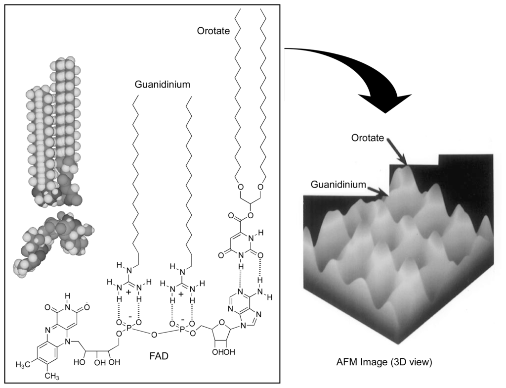 Binding of an aqueous guest to multiple amphiphiles in a monolayer should lead to formation of specific patterns in two-dimension [,]. The novel concept of two-dimensional molecular patterning was initiated by Kunitake and co-workers. In the first example, aqueous dicarboxylate can bind to two dialkylguanidinium molecules, and a spacer between the two carboxylates of the aqueous template affects the crystallinity of the guanidinium amphiphiles [,]. Monolayers transferred from aqueous oxalate (no methylene spacer) displayed a crystalline arc, whereas only an amorphous halo was observed for the monolayer from the pure water subphase. A rigid oxalate template bound the two guanidinium molecules and effectively weakened electrostatic repulsion among cationic guanidinium molecules through stoichiometric binding. When malonate [(CH2) spacer] or succinate [(CH2)2 spacer] was used as a template, the electron diffraction pattern could be assigned to a crystalline state, but the arc in the patterns broadened. A further increase in the spacer length [glutarate with (CH2)3 spacer and adipate with (CH2)4 spacer] again induced the amorphous phase of the monolayer. Melamine and barbituric acid (or related combinations) alternately bind through complementary hydrogen bonding, resulting in a molecular ribbon [–], which was kinetically analyzed by Vollhardt and co-workers using a sophisticated elemental set-up []. An AFM molecular image of the didodecylmelamine monolayer bound to the barbituric template could be easily observed, although the corresponding monolayer transferred from pure water was too fragile for AFM observation. An oblique array of methyl terminals was observed []. For molecular patterning with an aqueous template molecule having multiple binding sites, flavin adenine dinucleotide (FAD) was selected as an aqueous template and a recognition system with the guanidinium amphiphile and the orotate amphiphile was investigated (Figure 4) [, ]. AFM images of the formed complex transferred onto a mica surface showed the periodic brighter and darker portions that correspond to higher and lower regions of the monolayer surface, respectively. The height difference between the two peaks was estimated to be several angstroms. The AFM observation was similarly conducted on the corresponding monolayer transferred from pure water. The binding of FAD with the guanidinium/orotate mixed monolayer should dispose two functional units at the same level through binding to the template FAD molecule where the flavin unit in FAD may be buried under the phosphate group owing to the conformational flexibility of the FAD molecule, and resulting in a height difference between the two terminal methyl groups.