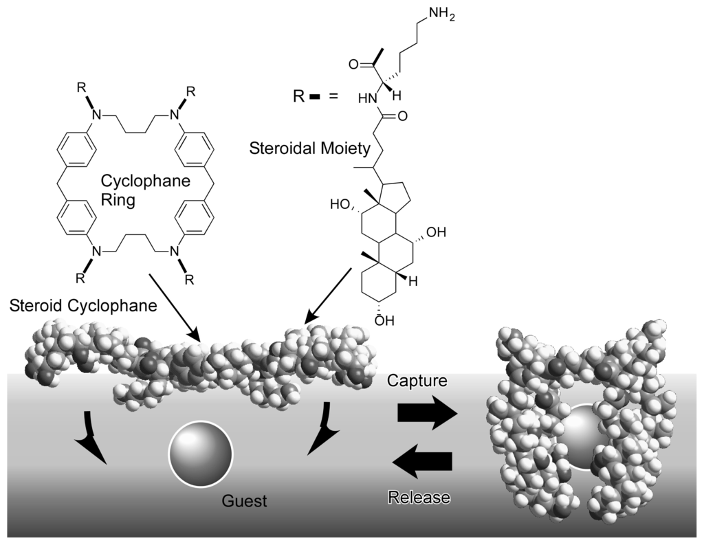 Dynamic molecular recognition by steroid cyclophane at the air-water interface. Reprinted with permission from [] ©2006, Royal Society of Chemistry.