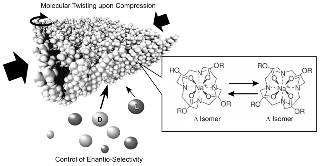 More recently, Michinobu et al. reported control of enantioselectivity of amino acid recognition by dynamic motion of a polycholesteryl-substituted cyclen complex host molecule at the air-water interface []. The octacoordinate sodium complex has two possible quadruple helicate structures (see Figure 6). Helicity is influenced by the chirality of the side arms especially when ordered or aggregated at the supramolecular level. Application of lateral pressure should affect the helix structure and, consequently, the diastereomeric stability of complexes with guest molecules. The K values of D-leucine are always greater than those of L-leucine, indicating that the cyclen monolayers have a stronger interaction with D-leucine. Conversely, the values of L-valine are smaller than those of D-valine at low surface pressure but exceed them at 22–23 mN m−1. In other words, chiral recognition in the cyclen monolayers with valine changes from the D- to L-form upon compression. It is remarkable that such small difference in the chemical structure between leucine and valine can be distinguished by the dynamic process of monolayer formation.