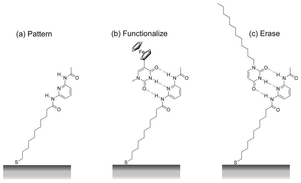 Functionalization and erasing at the surface of self-assembled monolayer. Reprinted with permission from [] ©2002, American Chemical Society.