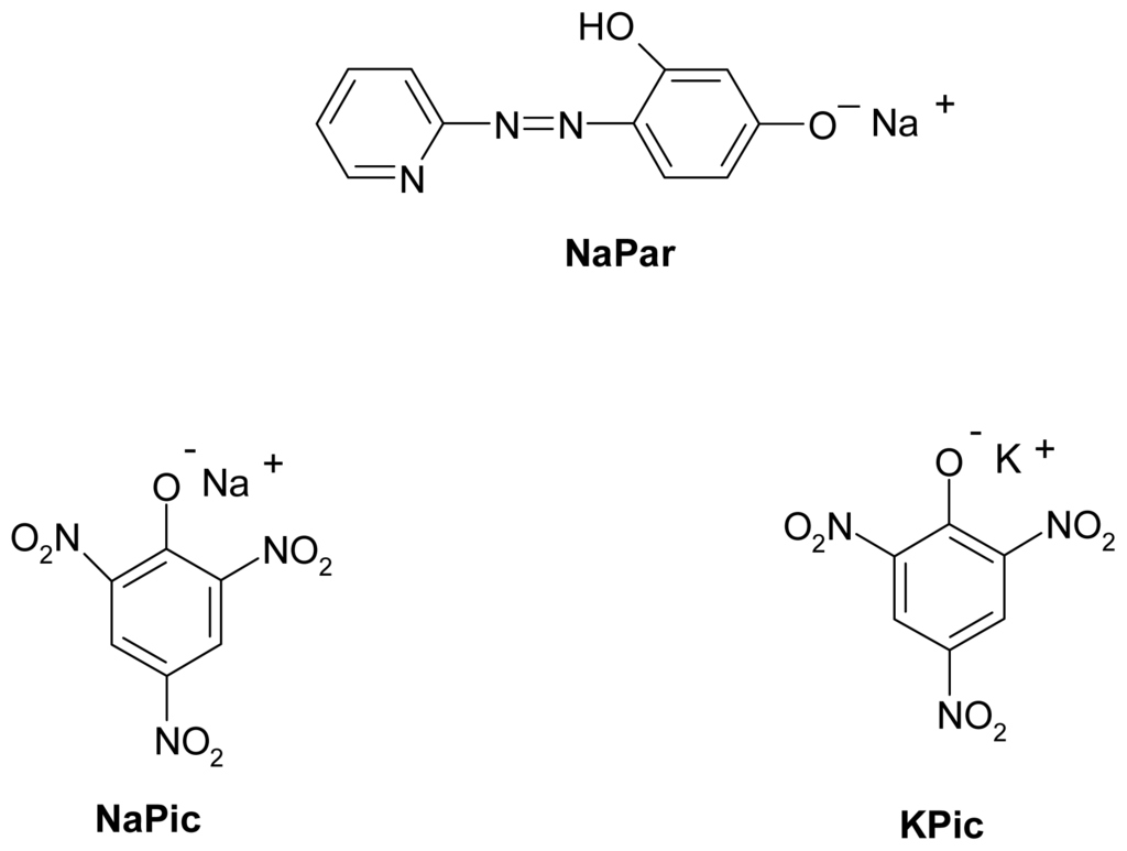 An anionic color compounds of 4-(2-pyridylazo)-resorcinol mono sodium monohydrate (NaPar), sodium picrat (NaPic) and potassium picrat (KPic).