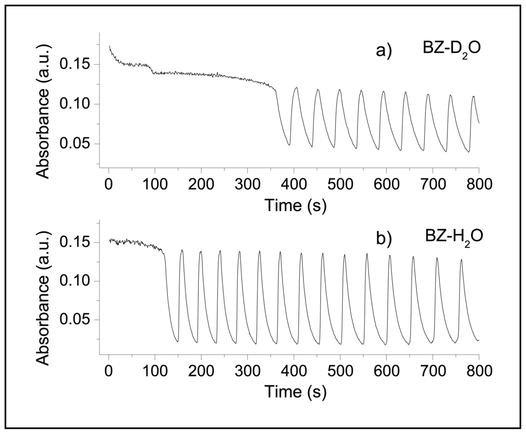7], nevertheless the global kinetics of the reaction results slower. Addition of deuterated reactants does not alter the qualitative profile of the absorbance as a function of time but influences the oscillatory parameters. This fact is particularly evident from a markedly longer Induction Period, from 150 seconds in H