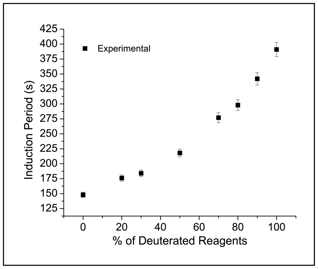 Measurements of BZ Induction Period were performed with a double beam spectrophotometer (Varian, 634 series), in thermostated quartz cuvettes (1 × 1 × 4 cm) at 20 °C following the behavior of Ce(IV) at λ = 320 nm. BZ oscillators in H2O and D2O were prepared using following stock solutions: CeSO4. 2H2O 8 × 10−3 M, MA 0.6 M, NaBrO3 0.18 M; each stock solution was 1 M H2SO4 or D2SO4. Reagents were prepared both in double distilled water and 99.98% D2O (SIGMA). BZ systems were prepared mixing normal and deuterated reagents in different proportions, in order to get a final composition of [MA]t = 0.1 M, [BrO3−]t = 3 × 10−2 M, [Ce]t = 1.3 × 10−3 M and 1 M H2 (D2)SO4, where [X]t indicates the sum of deuterated and normal reagents.