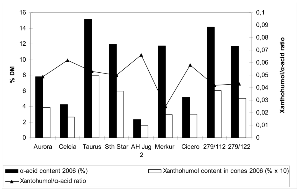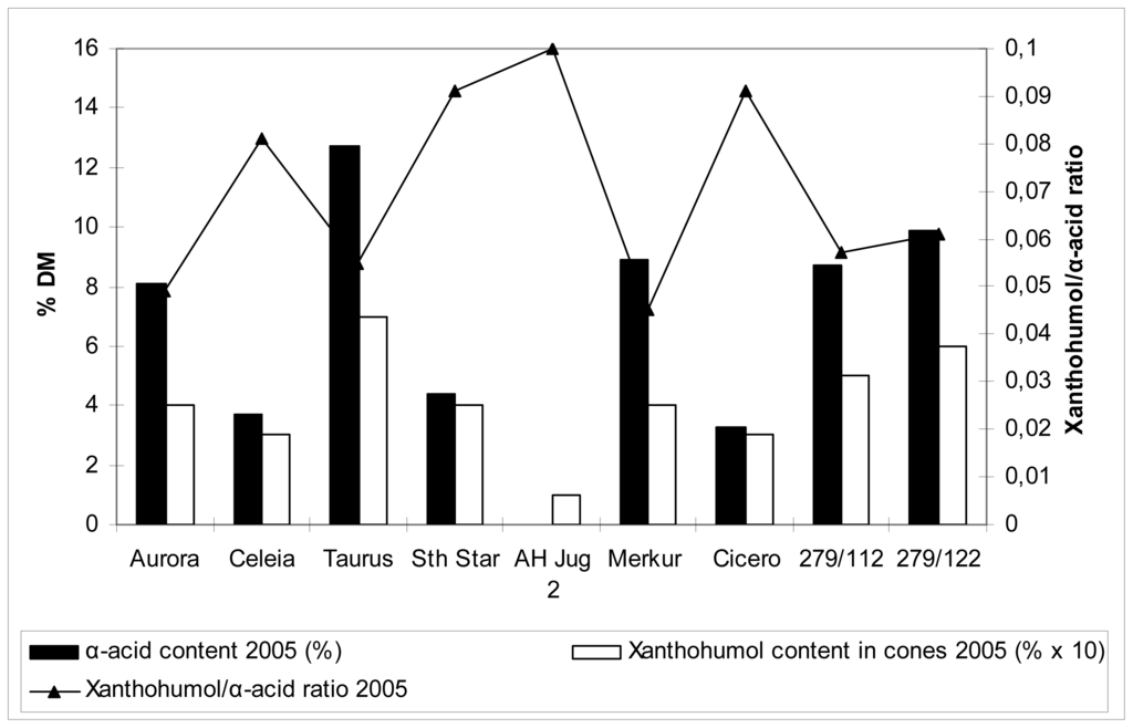 - Hrastar, R.; Kač, M.; Košir, I.J. Vpliv sorte in lokacije na vsebnost ksantohumola v hmelju. Hop Bull 2006, 13, 5–12. [Google Scholar]