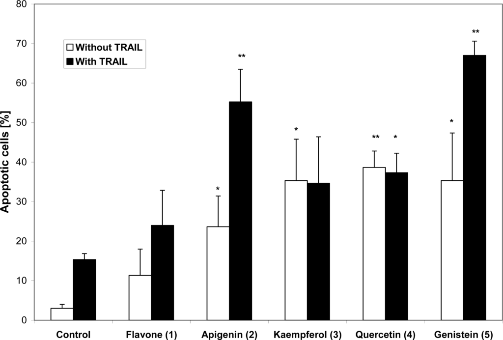 Flavonoids or with TRAIL combination increase the percentage of apoptotic cells (Figure 1). The most activity is marked for apigenin and genistein. Addition of TRAIL to kaempferol or quercetin did not change of the percentage of apoptotic cells. Both kaempferol and quercetin have hydroxyl group in position 3.