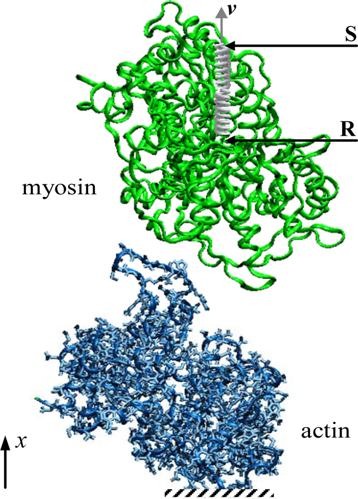 Simulation set-up for the evaluation of the interaction properties between myosin motor domain and actin monomer. The actin monomer was fixed, while the myosin motor domain was moved by means of a virtual spring. One end of the spring (R) was attached to the center of mass of the motor protein, while the free end of the spring (S) was moved at constant velocity (ν) in a direction (x) perpendicular to the longitudinal axis of the actin filament.