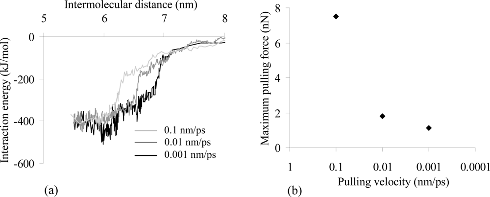 Moreover, as shown previously, the pulling force and consequently the interaction force highly depend on the pulling velocity. Since the unbinding force is smaller when the external load is applied slowly, we may expect a slight further decrease of the interaction force when performing SMD simulations with pulling rates lower than 0.001 nm/ps.