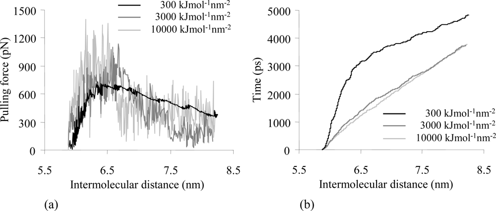 (a) Pulling force vs. intermolecular distance and (b) simulation time vs. intermolecular distance profiles for SMD performed with a pulling rate of 0.001 nm/ps and different spring constants (k = 300 kJ mol−1 nm−2 in black, k = 3000 kJ mol−1 nm−2in grey and k = 10000 kJ mol−1 nm−2 in light grey).