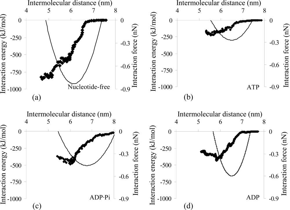 Profiles of the interaction energy (dots) and interaction forces (lines) as function of intermolecular distance of the actomyosin complex in different nucleotide-dependent conformations; nucleotide-free (a), ATP (b), ADP·Pi (c), ADP (d).